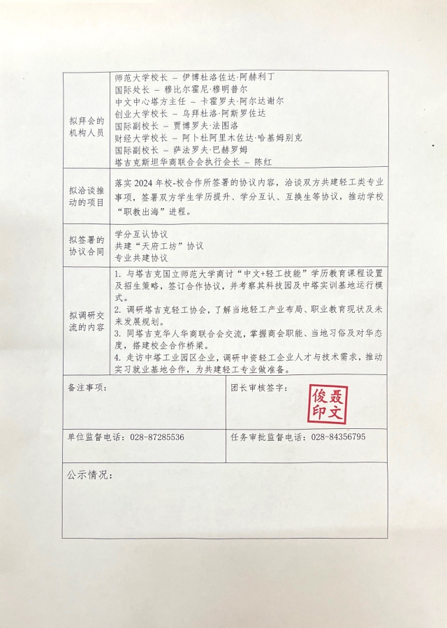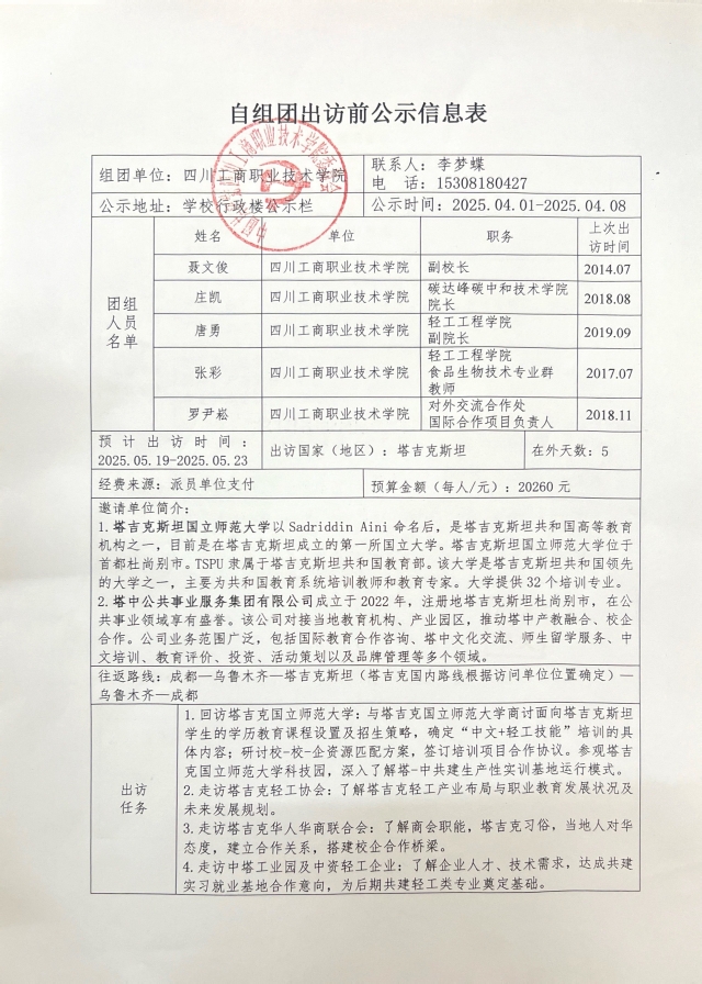 根据2025年我校因公出访计划任务,学院副校长聂文俊带队一行5人,于5月19日出访塔吉克斯坦,在塔停留5天,于5月23日返回成都。现将具体出访信息公示如下图: