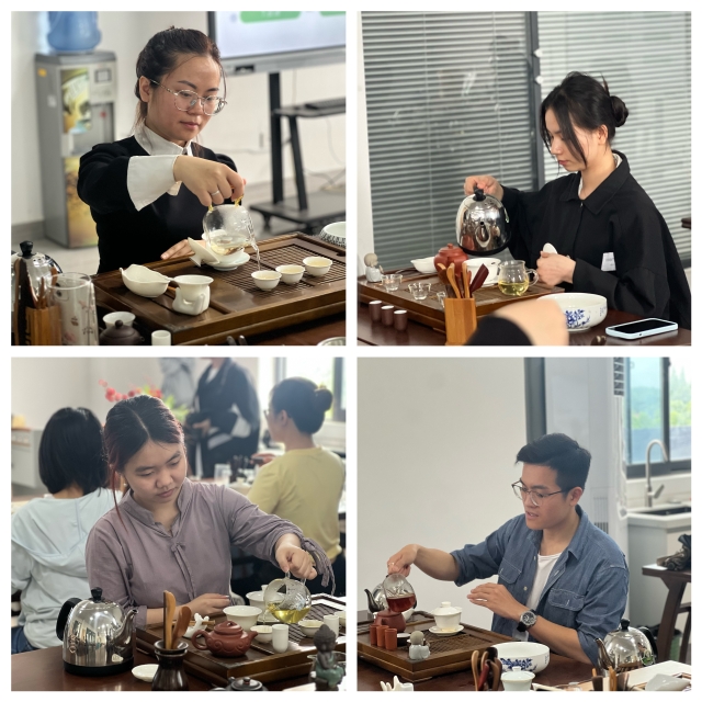在实践环节,在茶艺师的展示下,留学生兴致勃勃学习冲泡技艺,从“持壶手势”“注水力道”开始,一步步实践茶艺的完整流程。温杯洁具时,他们轻转茶盏感受温度;赏茶摇香时,他们屏息细嗅茶叶的清香;分茶敬茶时,他们谨记“先客后主”“七分满”的礼仪细节。通过亲手冲泡、品鉴,他们不仅掌握了茶艺技巧,更体会到中国传统文化中“以茶修心”的哲学意蕴。