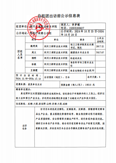 因公务需要,轻工工程学院院长魏明英带队一行5人,于12月9日出访日本,在日停留5天,于12月13日返回成都。现将具体出访信息公示如下图: