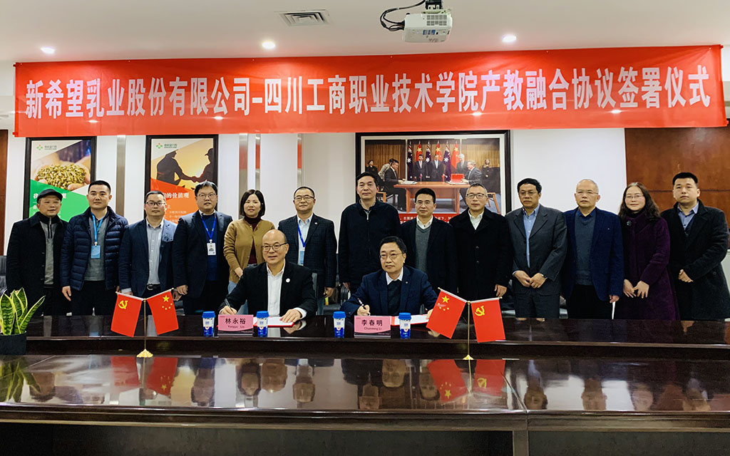 1月29日,我校与国内知名企业、四川乳业龙头企业——新希望乳业股份有限公司在新希望集团总部举行了产教融合协议签约仪式。我校党委书记管永林,党委副书记、院长李春明,党委委员、副院长王开淮,党委委员、副院长邓春生以及新希望乳业股份有限公司总裁朱川、副总裁林永裕等出席签约仪式,双方相关部门负责人参加签约仪式。