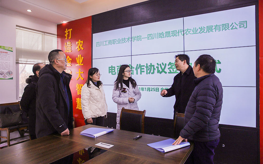 1月25日,我校与四川晗晟现代农业有限公司签订电商合作协议,我校党委书记管永林,都江堰电子商务学院院长梁正席,四川晗晟农业发展有限公司总经理张泽罗,金堂县赵家镇党委委员、副镇长杨臻,金堂县赵家镇农业综合服务中心负责人王治平出席签订仪式。