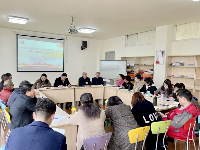 3月8日下午,学校党委组织集中学习习近平总书记在全国政协医药卫生界教育界联组会上重要讲话精神并进行了座谈。党委书记管永林出席会议并做总结讲话,党委副书记黄天贵主持会议,思政部主任李文晋领学了习近平总书记讲话的重要内容,党委委员、党委宣传部部长万辉君,党委教师工作部、政策法规处负责人及思政部全体教师参加会议。