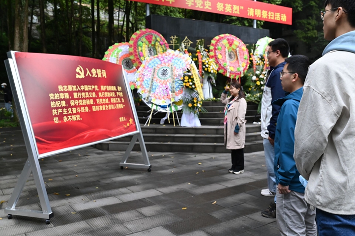碧血丹心泽苍生,铁肩担道铸初心。素花一束,祭英魂以深情,深鞠一躬,祭英烈以敬仰。全体师生依次缓步向前,凝望烈士墓,英灵浩气依然在。缅怀先烈英雄事,热泪盈眶祭英魂。随后,在信息工程系党总支书记孔蕊同志的带领下,新党员宣誓,老党员重温了入党誓词。