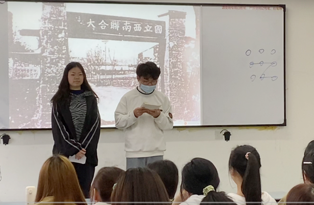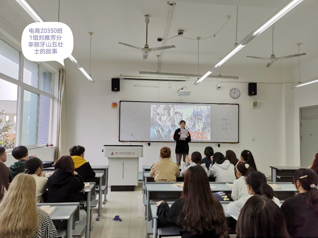 活动形式是在大一每个班的思政课前10分钟进行,每个班级学生分小组进行资料搜集,然后派代表上台分享,选题内容主要是来自革命战争年代、社会主义建设时期的感人故事。思修教研室李世勇老师指导的电商20350班的学生一组代表刘雅芳同学,她在讲台上生动形象的分享了狼烟山五壮士的故事。当她满怀感情,用生动形象的语言讲到狼牙山五壮士不怕牺牲,英勇战斗,直至为革命献出生命,这些革命烈士体现出革命理想高于天的伟大情怀。教室在座的各位同学深受感动,虽然以前听过,但当同学上台进行分享时,仍然感到深受触动,热血沸腾。网络20331班的同学在讲台上分享了陈树湘的故事。陈树湘是无数为中华民族复兴而奋斗的革命烈士之一,他以年轻的生命,实现了“为苏维埃新中国流尽最后一滴血”的誓言。还有的同学把抗战时期的西南联大的故事编成了情景剧,在班上进行了8分钟的表演。