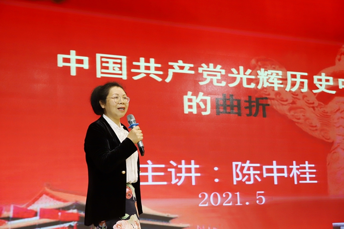 陈中桂教授以《中国共产党光辉历史中的曲折》为题,系统梳理了中国共产党在新民主主义革命时期、社会主义革命和建设时期、改革开放和现代化建设的新时期、中国特色社会主义新时代等四个历史时期曲折历史,结合大量的历史事件和历史史实,为我们重温了党的百年历史,并从远大的理想追求、科学的理论引领、选贤任能的机制、严密的组织纪律、严格的自我革命精神和强大的领导能力等六个方面,深刻解析了中国共产党为什么能。陈教授的宣讲视角独特,理论联系实际,既有历史的高度,又有理论的深度,更有情感的温度,受到与会者好评。