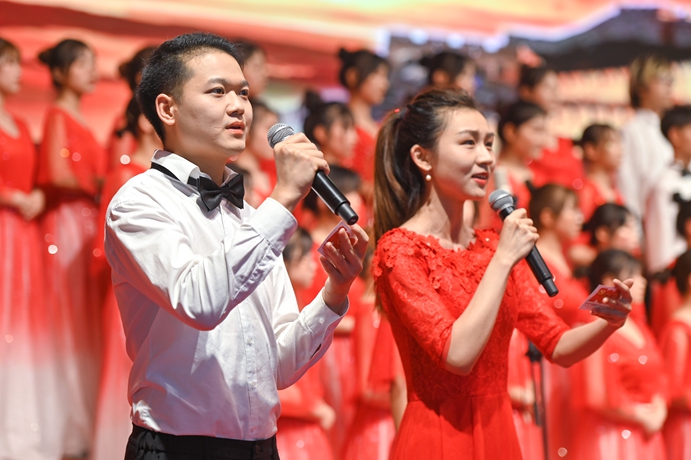 最后,全体校领导和现场师生共同唱响《没有共产党就没有新中国》,将汇演推向高潮,在充满激情的歌声中表达坚定不移感党恩、听党话、跟党走的如磐信念和不忘初心、砥砺前行的坚强意志。