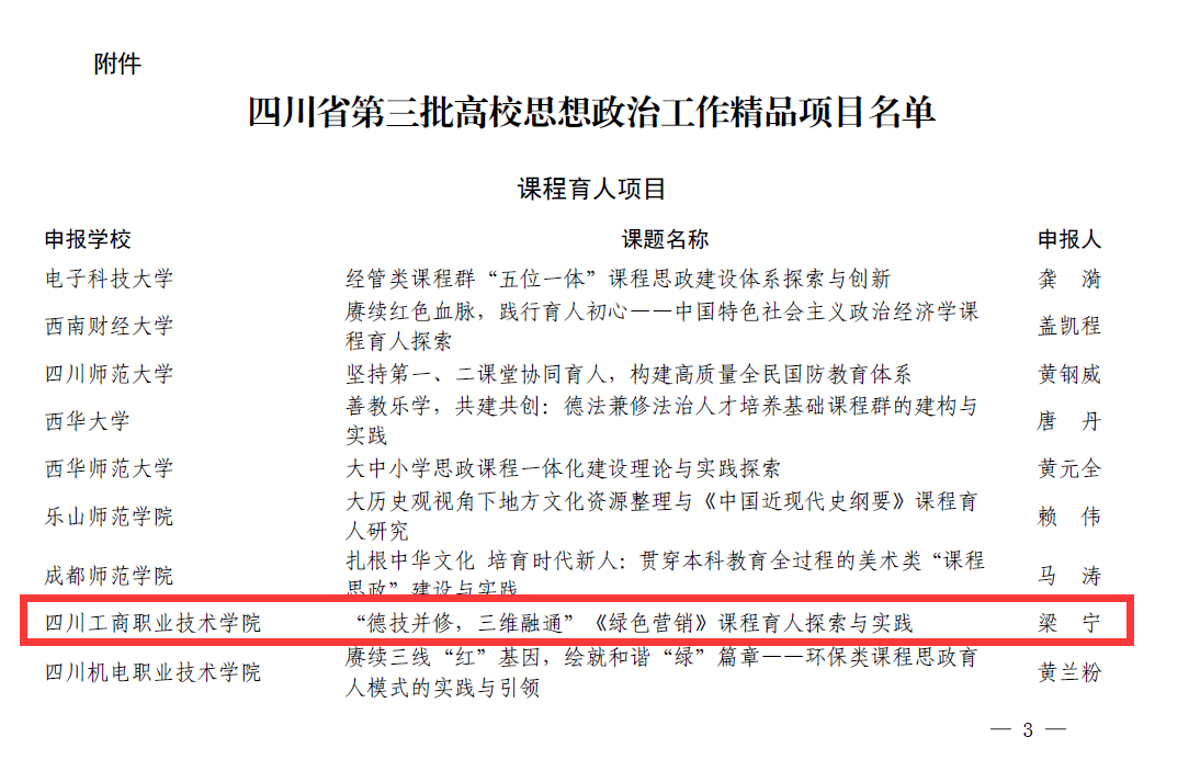 新年伊始,瑞兔报喜。近期省教育厅先后公布了第三批“三全育人”综合改革试点高校和第三批高校思想政治工作精品项目名单。学校跻身四川省“三全育人”综合改革试点高校行列,梁宁团队的课程育人项目“‘德技并修,三维融通’《绿色营销》课程育人探索与实践”、刘晓团队的心理育人项目“构建七大心理育人体系 全面提升心理育人水平”携手获评四川省高校思想政治工作精品项目。