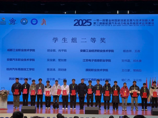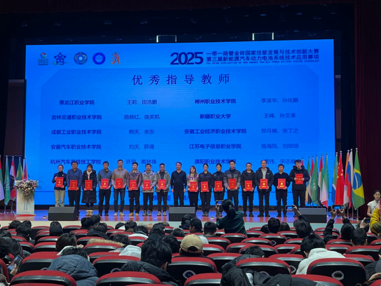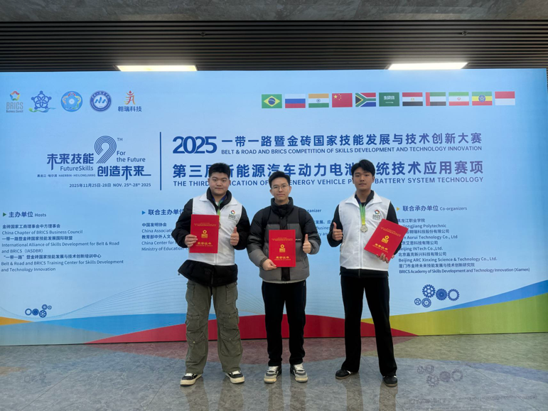 11月25日至28日,2025一带一路暨金砖国家技能发展与技术创新大赛之第三届新能源汽车动力电池系统技术应用赛项国赛决赛在黑龙江职业学院举行。在黄丹、万雄老师的指导下,碳达峰碳中和技术学院新能源汽车技术专业杨仁杰、王云炀同学以全国前12名的优异成绩,荣获大赛银牌,学校获评“优秀组织奖”,黄丹、万雄获评“优秀指导教师”。