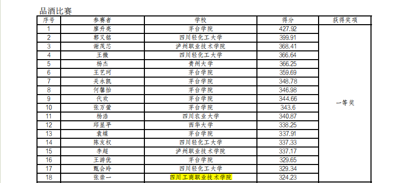 2025年12月16日至17日,由中国酒业协会全程指导的2025年“五粮液杯”中国酒类创新创意大赛在四川轻化工大学中国白酒学院成功举办。我院轻工工程学院选派酿酒技术专业的8名学生,在吴霞、史学琴两位教师的带队下,参与品酒赛道的激烈角逐。同学们凭借扎实的专业知识、敏锐的感官品评能力和稳定的现场发挥,取得优异成绩。其中,张崇一同学荣获大赛一等奖,李欣语等7名同学分获二、三等奖。