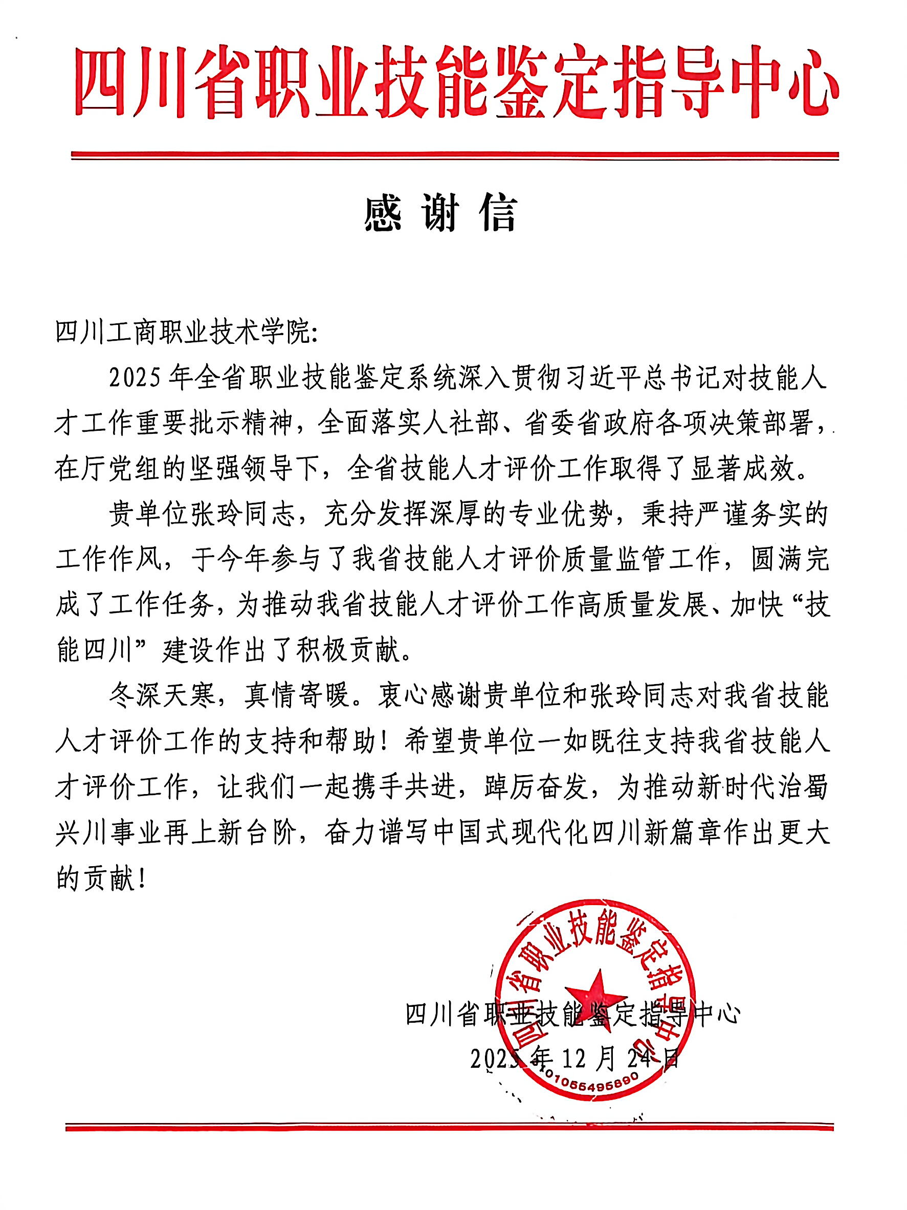 近日,四川省职业技能鉴定指导中心向我院发来感谢信,对继续教育部张玲老师在2025年全省技能人才评价质量监管工作中展现出的高度责任感、专业素养及突出贡献,予以诚挚感谢和高度赞誉,这既是对教师个人履职成效的认可,更是对我院技能人才培养与评价工作的权威肯定。