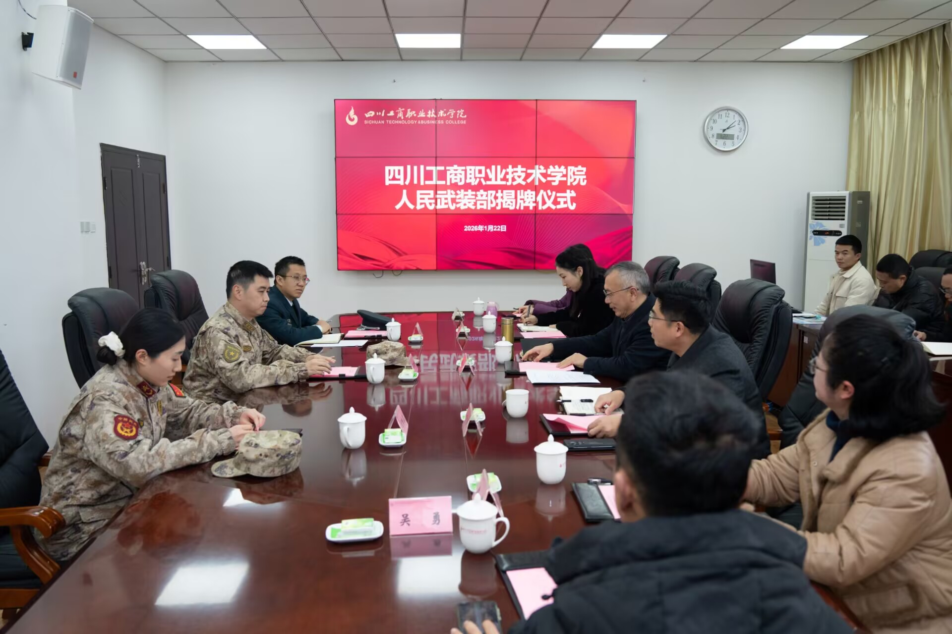 2026年1月22日下午,我院举行人民武装部揭牌仪式。学院党委副书记、院长邓春生,都江堰市人民武装部部长周晓枫出席仪式并讲话。仪式由学院党委常委、副院长刘文钦主持。都江堰市人民武装部相关领导及学院党委宣传部、党政办、党委学生工作部、保卫处等职能部门负责人参加会议。