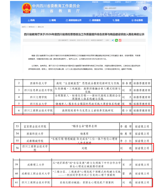 近日,四川省教育厅公布了2026年度高校思想政治工作质量提升综合改革与精品建设项目入围名单。我院选送的3个项目凭借扎实的工作基础与鲜明的特色优势均成功入围。
