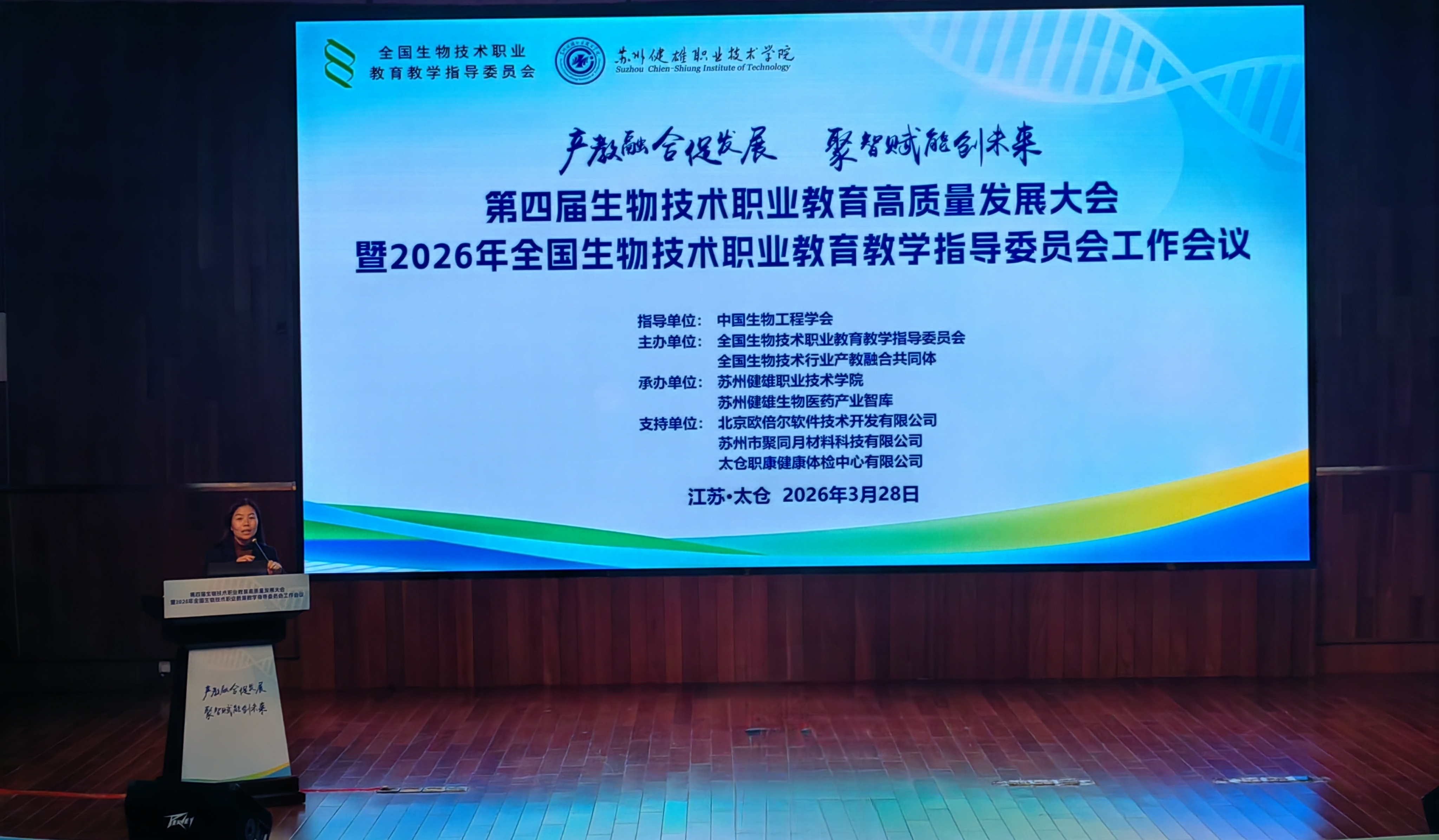 为深入推动生物技术职业教育高质量发展,凝聚行业共识,探索产教融合新路径,近日,第四届生物技术职业教育高质量发展大会暨2026年全国生物技术职业教育教学指导委员会(以下简称“生物技术行指委”)工作会议在苏州健雄职业技术学院顺利举行。学院党委常委、副院长魏明英、轻工工程学院食品生物技术专业主任王静霞受邀参会,参与各项议程,助力生物技术职业教育改革发展。