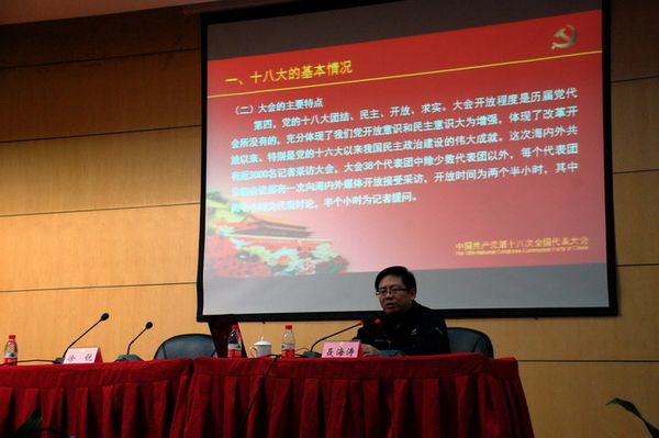 报告会特邀党的十八大代表、博士生导师聂海涛研究员主讲,他以自己的亲身感受,围绕一个好的报告和一个好的班子产生过程,从大会基本情况、四川团参会情况、大会选举情况、大会报告主要精神等四个方面,生动、详实进行了解读,让听众感受到了中国共产党的伟大和对美好未来的憧憬,增强了对中国特色社会主义的道路的自信、理论自信、制度自信,对中华民族伟大复兴的自信,对建设美丽中国、开创美好未来的自信。在近3个小时的报告会临近尾声时,聂海涛研究员说,学习贯彻党的十八大精神,就是要紧紧抓住坚持和发展中国特色社会主义这条主线,围绕习近平同志提出的“五个深刻领会”,明确“旗帜问题、奋斗目标、道路问题和精神状态”,紧密联系改革开放和现代化建设实际,紧密联系本地区本部门工作实际,紧密联系广大人民群众所思所想所愿所盼,推动报告确定的各项目标的实现。