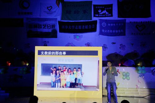 晚会首先以优美的情景舞蹈《礼仪之邦》开场,旨在给大家传递中华民族传统美德。接下来,乐天公益组织发起人张娟同学与大家分享了她做公益的心路历程以及对今后志愿者事业的设想,真诚的言辞获得了大家的阵阵掌声。随后,其他高校志愿者们纷纷带来了他们的节目,其中四川农业大学都江堰的情景剧《志愿者在心中》还原了四川山区留守儿童生活学习的画面,听着孩子们一声声的呐喊:“我要读书,我要最美的未来”,在场所有人都切身感受到孩子们对知识的渴望以及志愿者事业的重要性。深情的演唱,热烈的舞蹈将每个人都带入到激情四溢的氛围中。成都电子科大、成都农科职院的志愿者们也带来了精彩的节目。