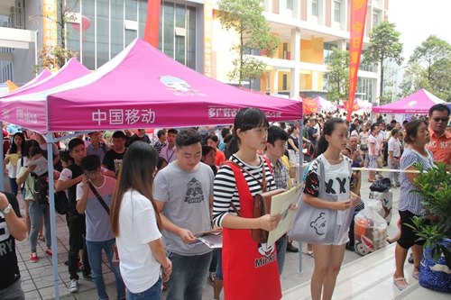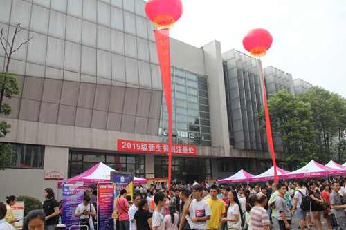 许多新生在家长的陪伴下到校报到,数千人涌入校园。