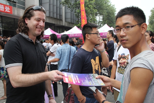 怎么老外也在现场宣传呢,原来是美国普利茅斯州立大学的老师在推介与我院开展的国际交流合作项目。