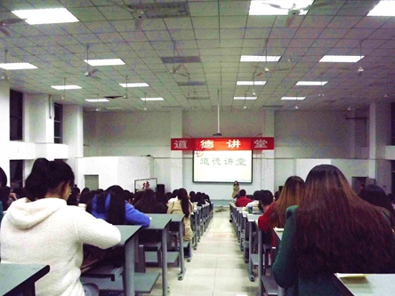 此次活动以全体师生起立向德字鞠躬来拉开帷幕,首先播放了阿坝援藏和支教团队的视频,传递出了浓浓的爱心;随后邀请了董颖老师及几名支教参与者分享了自己的经历,他们对于支教的真挚情感,感动了在场的每一个人。活动中还穿插了舞蹈《礼仪之邦》和互动环节,同学们都积极的参与互动并以便利贴的形式回答屏幕上的关于道德、公益、志愿的问题,主持人随机抽取幸运观众并送上精美笔记本的环节让全场的气氛到达了高潮。最后活动在歌曲《挥着翅膀的女孩》中圆满结束。