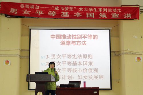 本次宣讲会以“性别平等,让世界更美好”为主题。许教授从社会性别理论概述、成长中的性别议题、性别平等的主流化趋势等三个方面深入浅出的介绍了男女平等基本国策的主要内容,她通过鲜活、典型的事例从不同的视角来解读当前男女平等的现状,并引导同学们正确看待男女平等的问题。许教授语言轻松幽默,现场气氛活跃。宣讲会最后,她呼吁所有的女生要打破限制,做一名自信、自立、自强的女大学生。