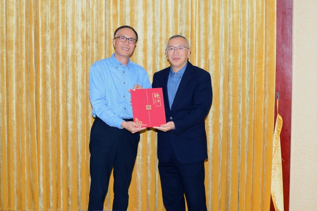 邓春生代表学院向袁博士及各位企业家代表表示热烈欢迎,并为袁志润博士与朱友胜教授颁发学院现代造纸技术专业“特聘教授”聘书。