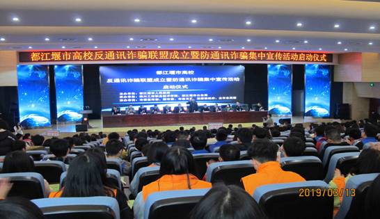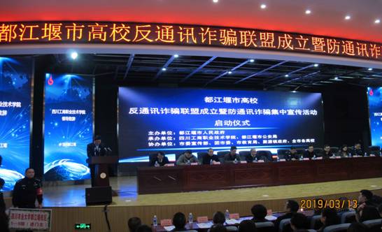为进一步建立完善警校共建机制,实现学校与公安、综治等部门在治安防范、民警快速反应、法制安全教育等方面的有机联动,形成齐抓共管的工作合力,都江堰市公安局于2019年3月13日下午在我校2教B座多功能厅,举行都江堰市高校反通讯诈骗联盟暨防通讯诈骗宣传活动启动仪式。