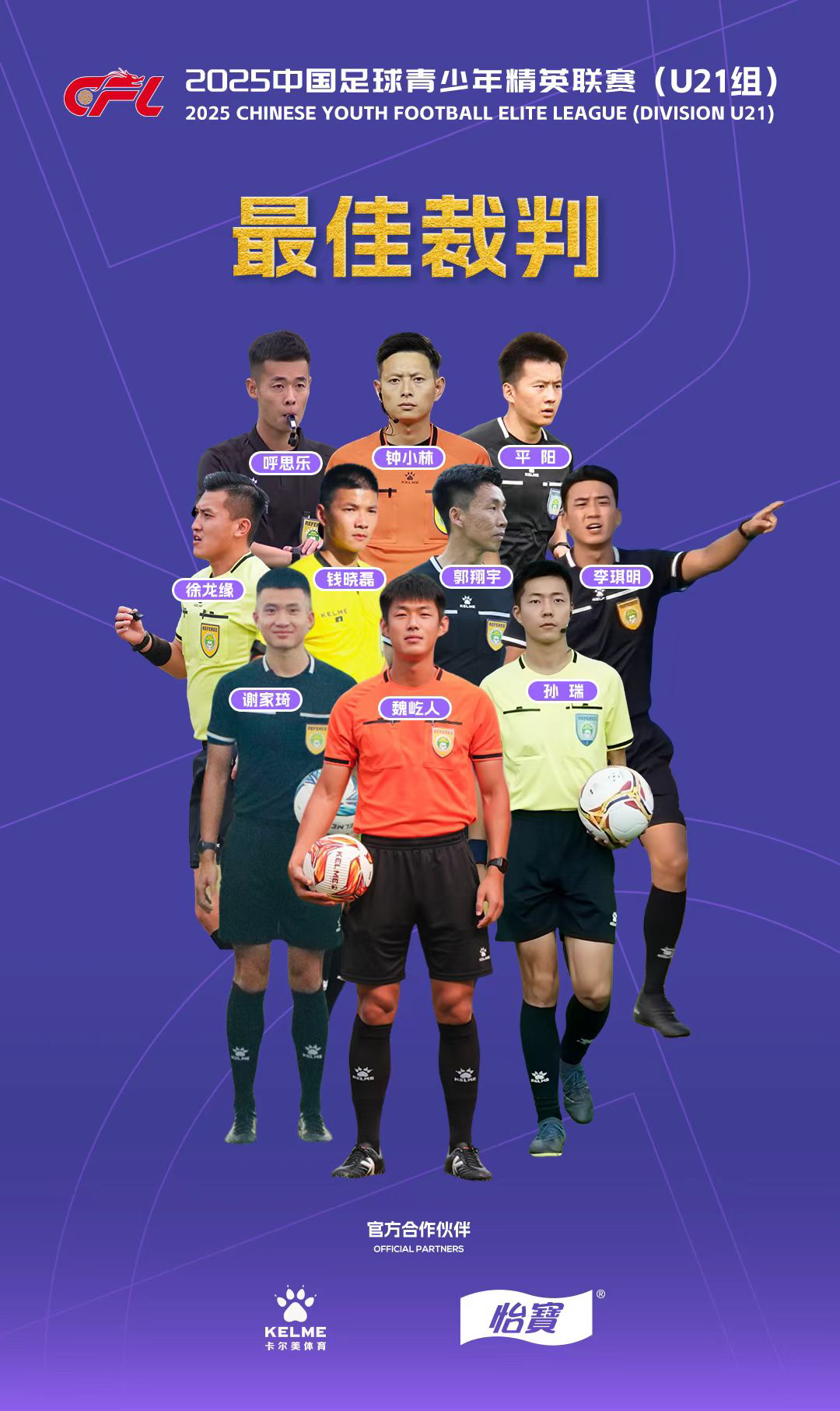 中国足球青少年精英联赛(U21组)由中国足球职业联赛联合会主办,分别在广东珠海、辽宁大连、云南玉溪、海南海口等地进行了四个阶段的比赛,是国内目前水平最高、规模最大的青少年足球赛事之一,旨在发掘和培养中国职业足球后备人才,推动青少年足球运动的精英化发展。本次赛事对裁判员的专业能力、应变能力和职业操守提出了极高要求。作为本次赛事的骨干裁判员之一,谢家琦老师全程参与并出色完成从区域预选赛到全国总决赛的多场关键执裁工作,其执裁场次达20余场,涵盖小组赛、淘汰赛及总决赛等重要阶段。