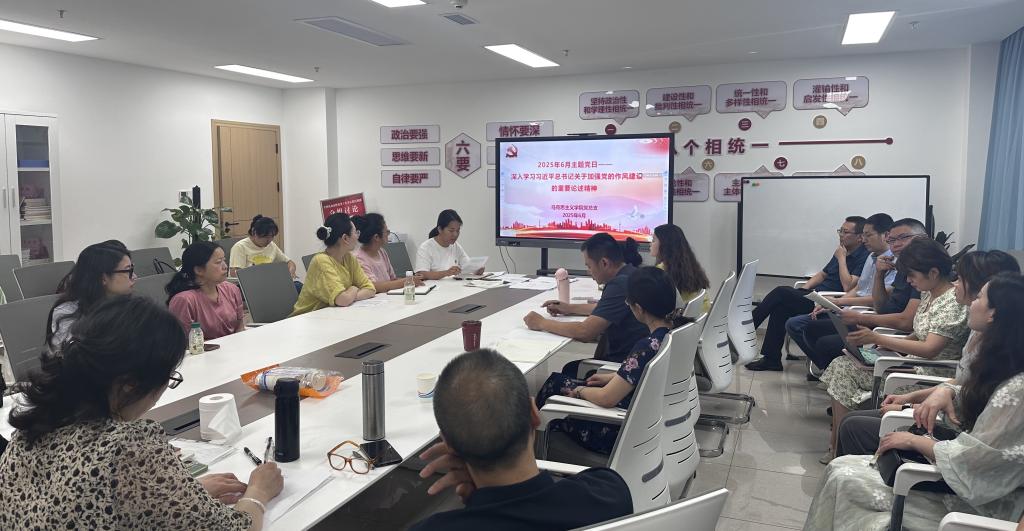 6月11日上午,马院党总支召开6月主题党日活动。41名党员参加。学校纪检委员郭卿列席会议。党总支副书记李丹丹主持会议。